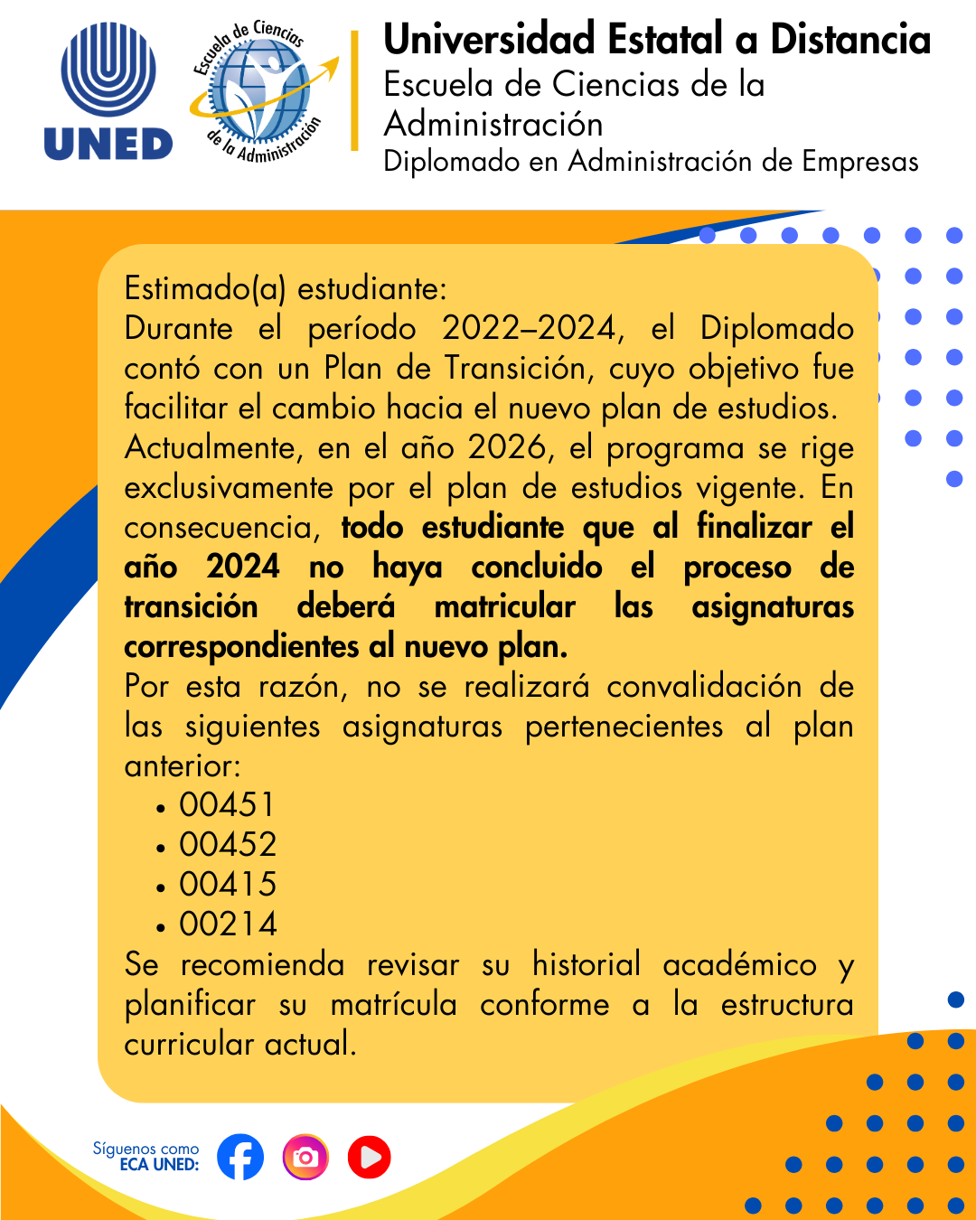 Se recomienda revisar su historial académico y planificar su matrícula conforme a la estructura curricular actual.